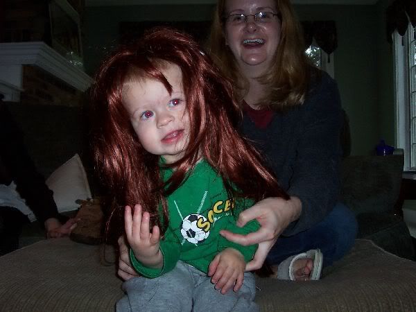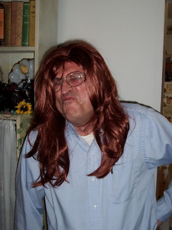 Here's my dad...he looks like a total goof here if you ask me. He was all excited to put the wig on. He ran upstairs and grabbed one of his wife's scrunchies and everything.