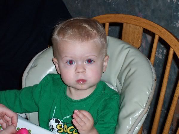 I did take a cute pic of him without the wig while he was eating. WELL - AFTER my dad decided to torture him with yet another wig!