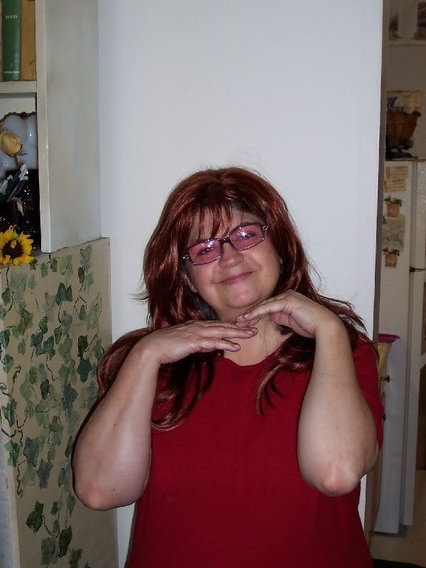 Here is John's mom who, as you can tell, was delighted to try on the wig. Strike a pose: