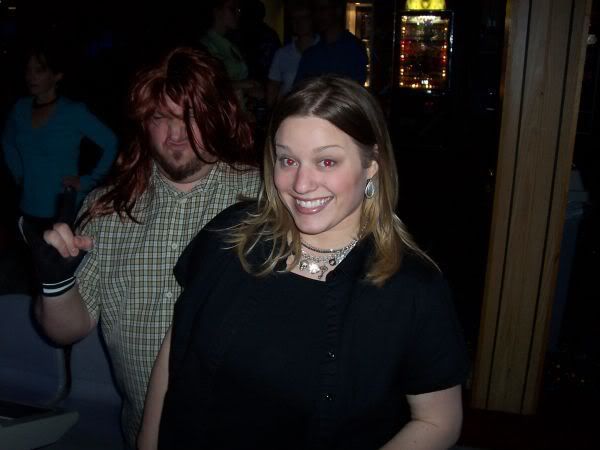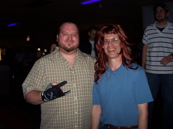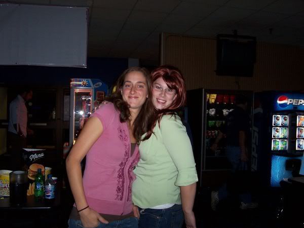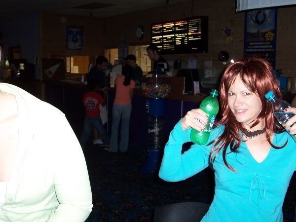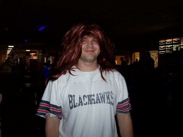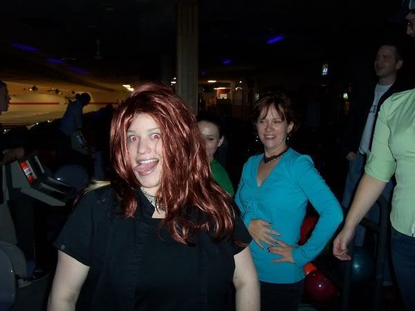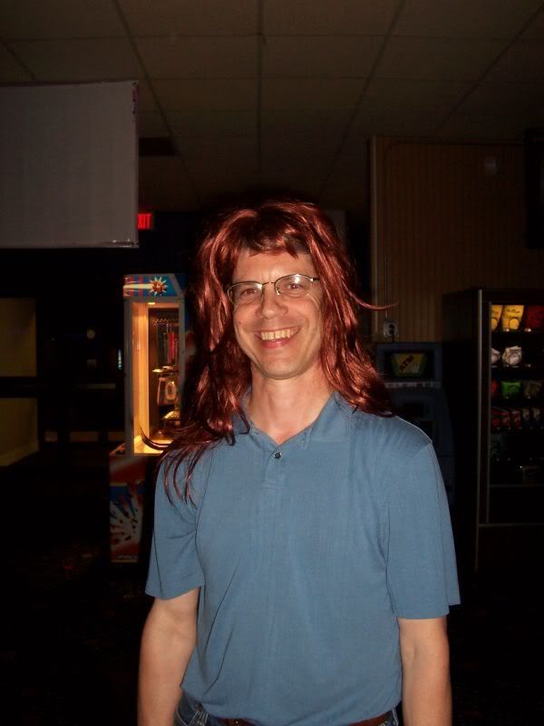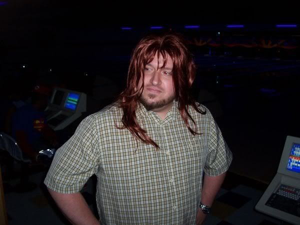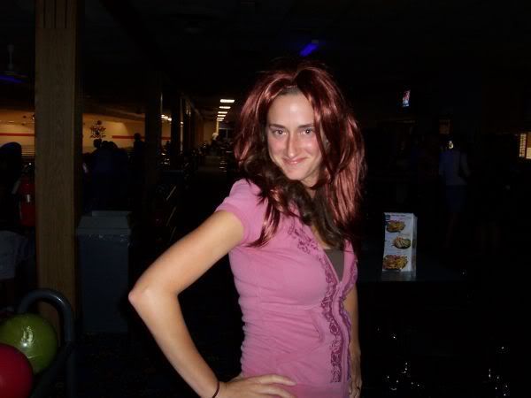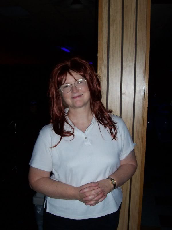 Shelly, in the wig, at the bowling alley. She's one hot mama!