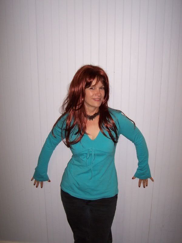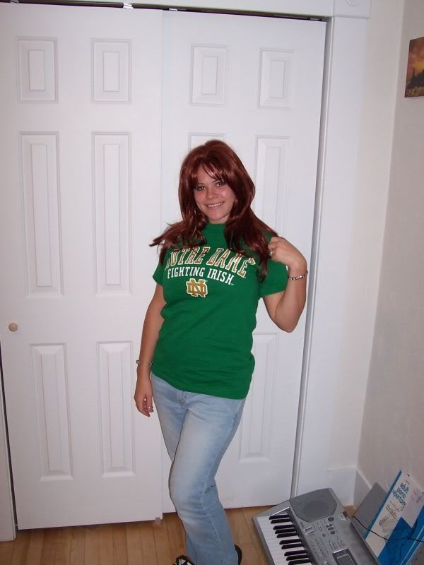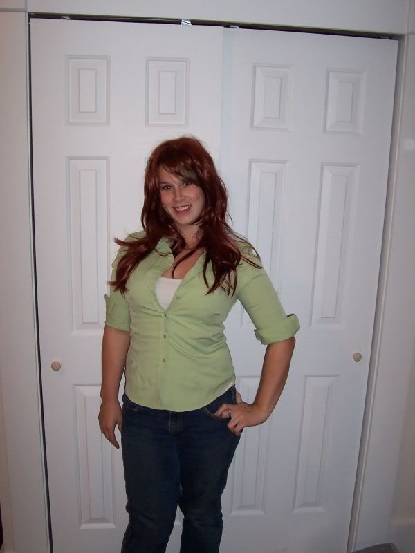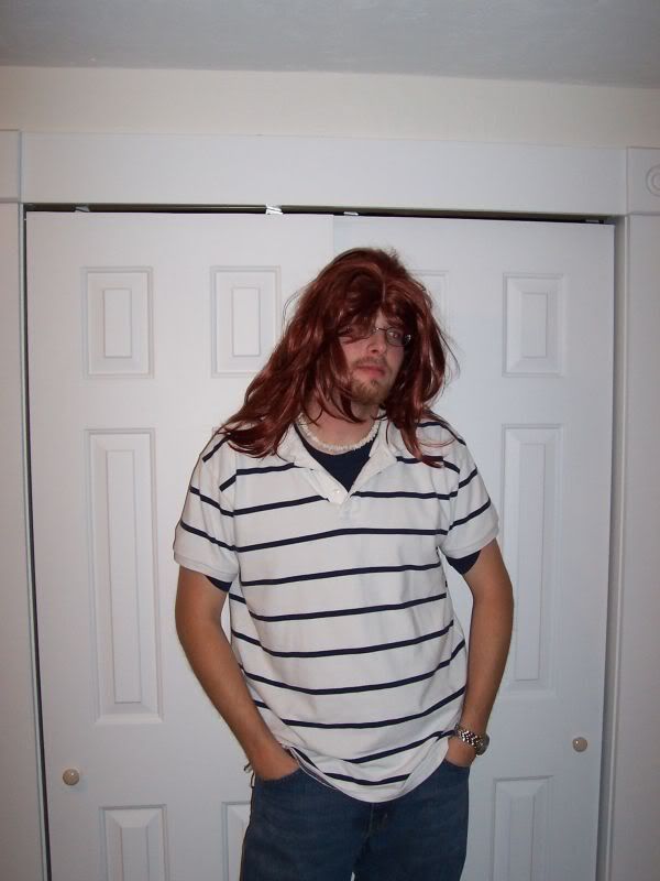Sean's girlfriend Mary, in the wig, before leaving for bowling (he was so proud that he got her to wear this shirt: