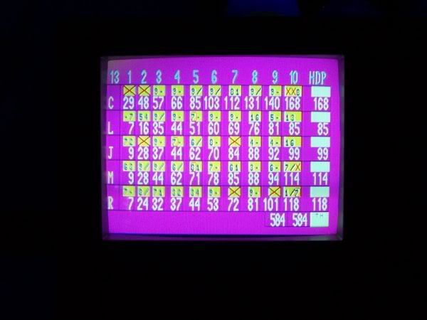 Here was the last scoreboard of the night...it goes Charlie, Linda, John, Melissa, Ron. I wasn't the worst!