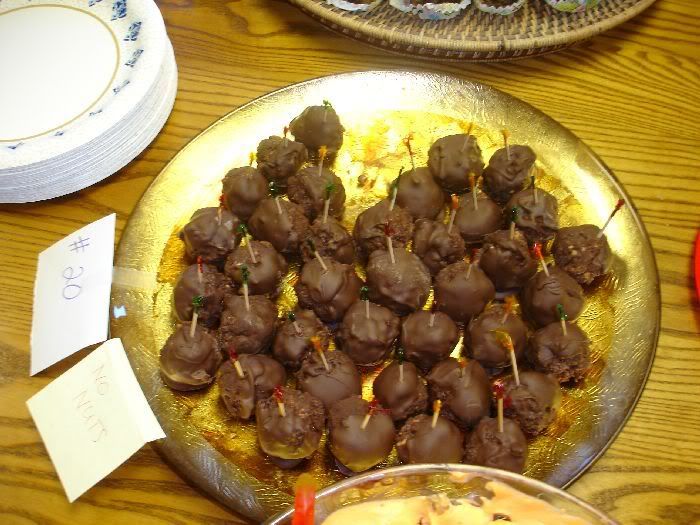 I took one box of brownies, baked them, dumped a bag each of white chocolate chips, dark chocolate chips and toffee chips, rolled them into balls and dipped them in milk chocolate. They are kind of solid and if you didn't know it, you probably would never guess there was any kind of brownie in there! Anyway, they are delicious!