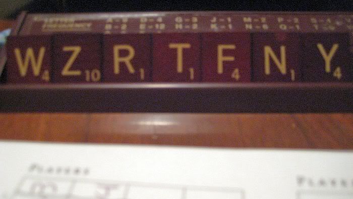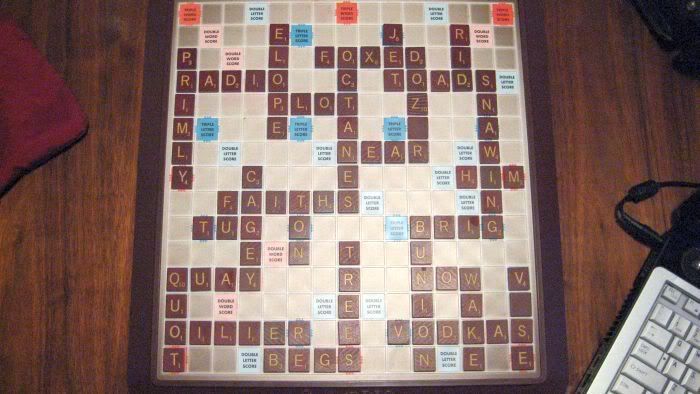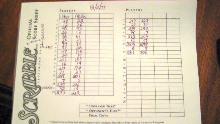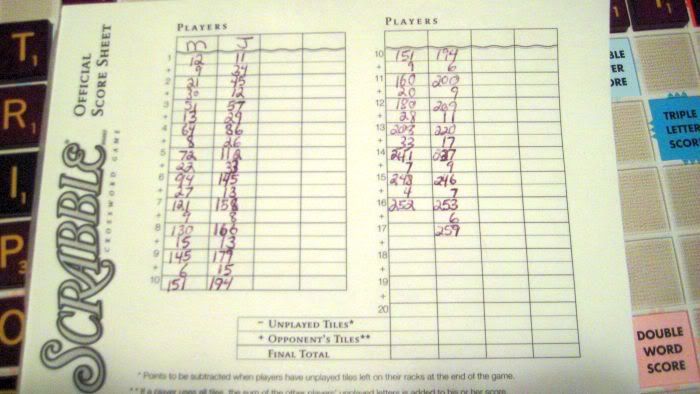John and I just got done playing Scrabble. I said I was going to beat him, but sadly, I did not. Here is the fruit of our game: