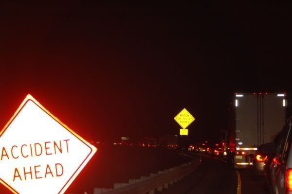 Ohhhh....so then we get on the highway and John is doing 88-ish in the fast lane and we start coming up on this busted old Camaro, with like 27 people in it, driving in the fast lane, slow with the hazards on. John slowed down but got pretty close to the car expecting them to move out of his way. Well, apparently they didn't want to move, so John put on his high beams. They responded with a couple of brake checks. Finally, they passed the 18-wheeler they were using to block us from gettng around and they got in the right lane. John blew past them but ended up stuck behind another car not a minute later. In the rear view mirror...here comes the Camaro again. He got right up behind us and John put his hand up and waved (sarcastically, if that is possible) to them. Then we got the high beams from them and at this point, John and I were laughing thinking okay you got us back, ha, ha. The Camaro then comes up alongside us on the right and I look over expecting to see this guy smiling or something. He's got his window down, arm hanging out pointing at me, face red and he's yelling and spitting at us! This guy looked like he was going to murder someone, for really reals. I started getting scared but John was like, "I'll pull over, this $%^&* wants me to pull over." I yelled at him an told him absolutely not. This guy kept driving right next to us and yelling and flipping us off and trying to get us to pull off the same exit...but thankfully, John kept driving. I'm SO glad the guy got off the highway because about 5 minutes later, we hit this: