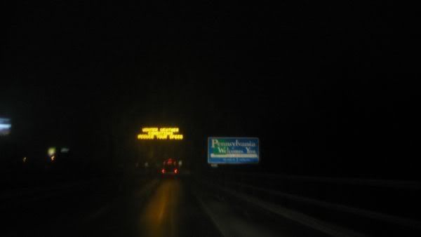 it kinda sucked - but we kept ourselves entertained singing along to Chumbawumba, Garbage, Rammstein, Disturbed, Morrissey, Yes, Kansas and a bunch of other stuff shuffling through my M. We must have passed at least 15 cars that were either off the road, on the edge of the road, or surrounded by emergency vehicles and all smashed up. People need to learn how to drive in snow or stay home! We finally did make it to PA: